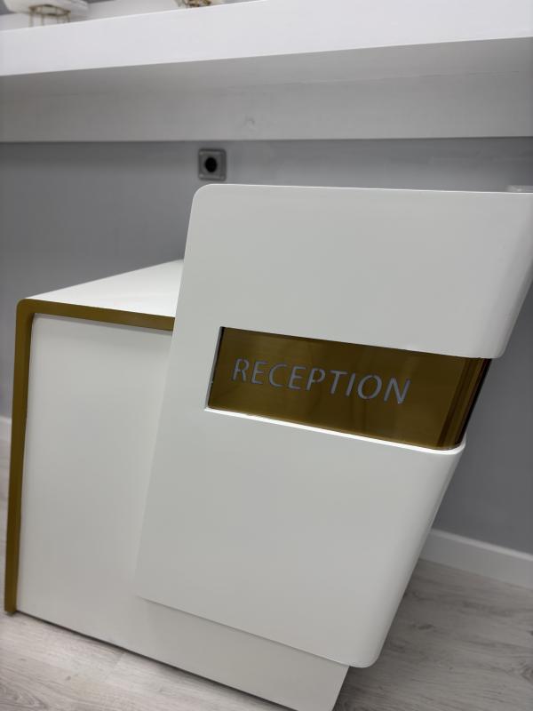 Mostrador recepción blanco con detalle dorado e iluminación LED integrada. Diseño compacto y elegante, ideal para estética, clínica o spa. Está sin estrenar, en estado impecable; no se adapta al espacio. Precio450 € negociables.