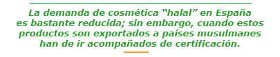 Según Isabel Romero, directora del Instituto Halal con sede en Almodóvar del Río, la demanda de dichos productos en España es bastante reducida, "sin embargo, cuando estos productos son exportados a países musulmanes han de ir acompañados de certificación". A diferencia de lo que ocurre con otros productos como la carne, con los cosméticos y perfumes es bien distinto. No se controla su proceso de elaboración, sino que, una vez elaborado, el Instituo Halal se encarga de detectar si contiene algún elemento que no se ajuste a lo establecido como halal. "Lo que nosotros hacemos es una analítica de su composición, de manera que no contenga porcino o alcohol y emitimos un informe para otorgar el certificado" explica Romero.