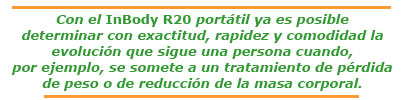 El problema hasta ahora era que estos analizadores, por sus dimensiones y precios, sólo estaban al alcance de algunas entidades. El InBody R20 crea un nuevo concepto en lo que a estos dispositivos se refiere, siendo el primer InBody portátil. Con él ya es posible determinar con exactitud, rapidez y comodidad la evolución que sigue una persona cuando, por ejemplo, se somete a un tratamiento de pérdida de peso o de reducción de la masa corporal.