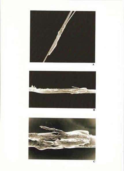 B.- En esta imagen, se ha forzado la separación de pelo y aguja, quedando patente el rastro que ha dejado ésta en toda la extensión de la vaina interna.