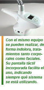 Con el mismo equipo se pueden realizar, de forma indolora, tratamientos tanto corporales como faciales. Su pantalla táctil incorporada facilita el uso, indicando siempre qué sistema se está utilizando.