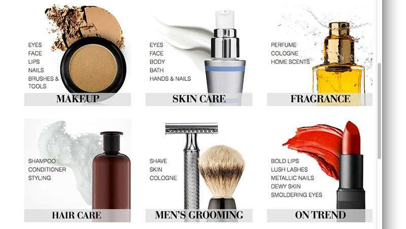 La tienda ofrece tres formas de búsqueda (contenido, marca y categoría) y se divide en siete secciones: maquillaje, cuidado de la piel, fragancias, capilar y productos de cuidado personal masculino