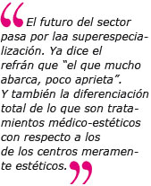 A.M.B.: La superespecialización. Ya dice el refrán que “el que mucho abarca, poco aprieta”. Y también la diferenciación total de lo que son tratamientos médico-estéticos con respecto a los de los centros meramente estéticos.
