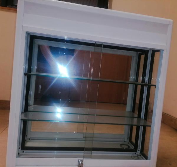 Hechas a mano, aluminio macizo, lacadas al horno en blanco, trasera de espejo, estantes de cristal grueso, puertas frontal con cerradura. Medidas: