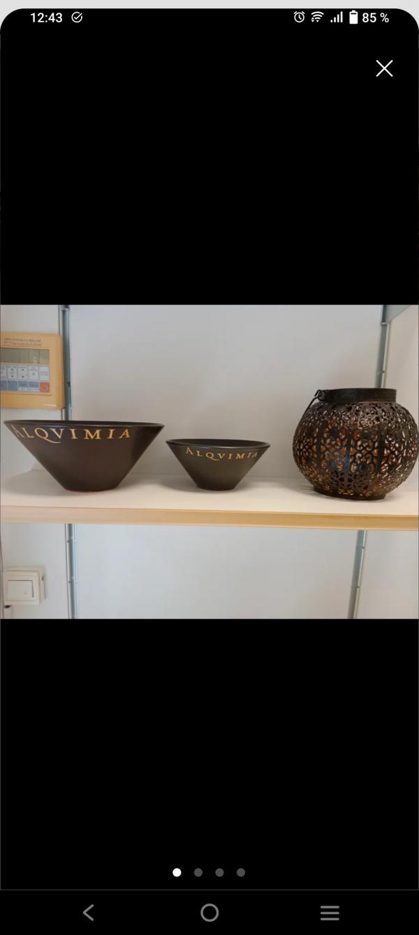 2 bols con el nombre y cerámica buena 2 tamaños diferentes, el logo de Alqvimia en placa metal dorado, cajitas y bolsas con logo. 18€