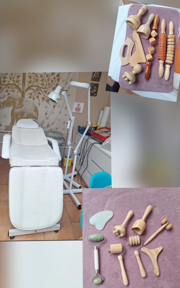 Camilla con agujero facial, Lupa, Lampara de infrarojos, Maderoterapia Facial y Corporal