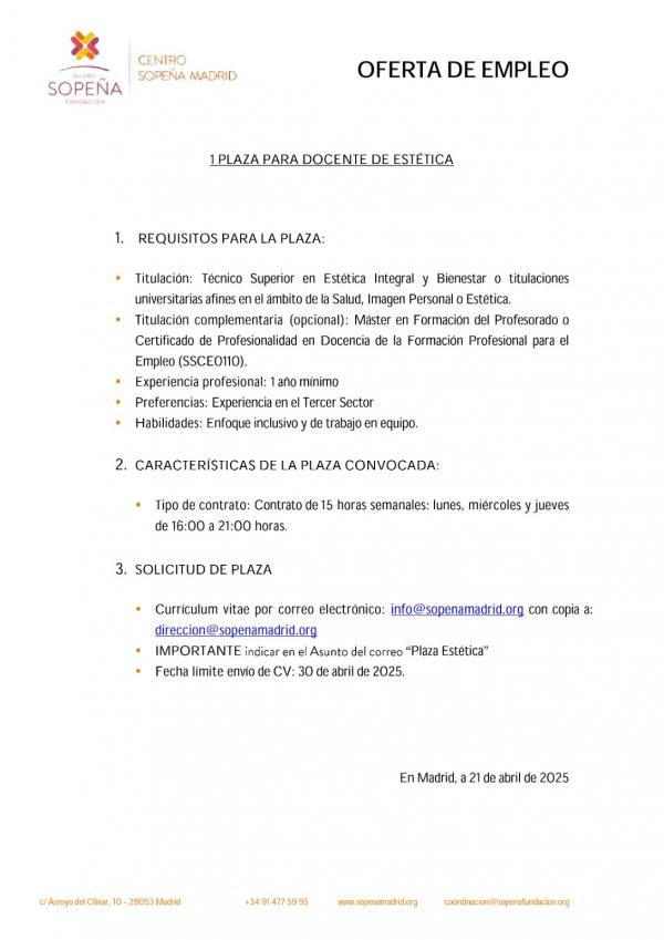Busco Profesora de Estética (maquillaje y masaje) para Centro Sopeña ubicado en Arroyo del Olivar 10 (Vallecas)