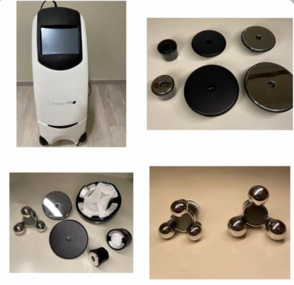 6 pads dual (soft laser, corriente bioactiva CBA, radiofrecuencia) y un manipulo manual dando un buen resultado en los tratamientos, se incluyen los aceites de trabajo