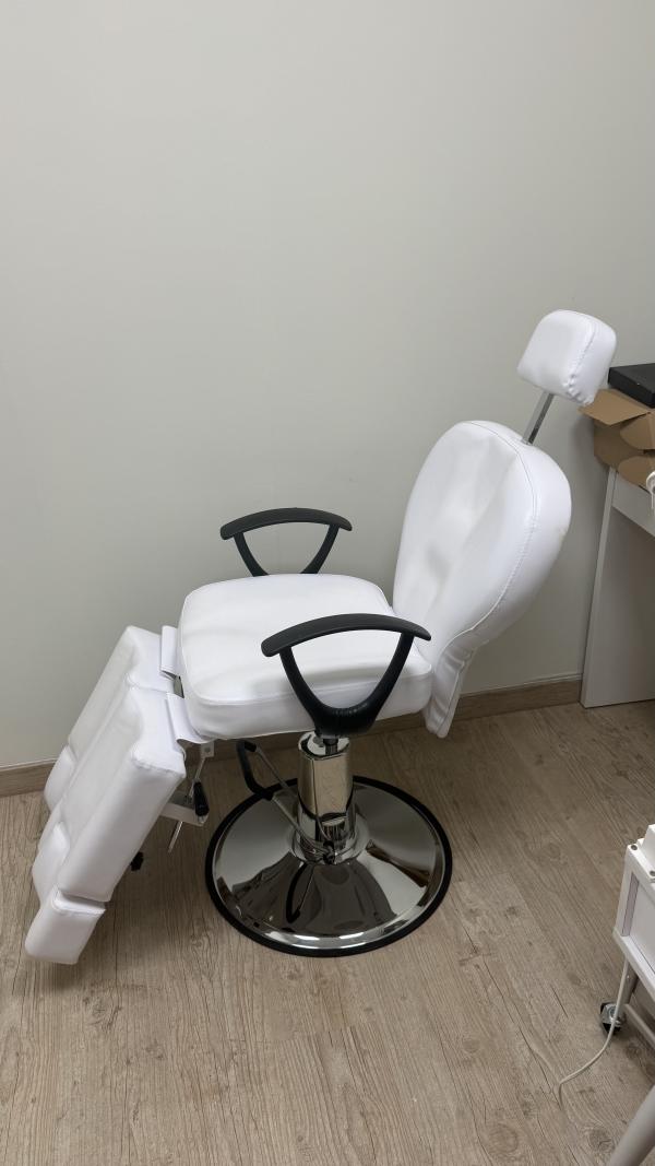 Vendo sillón de pedicura hidráulico en altura con respaldo y piernas inclinables, reposa cabeza estraible. Cuero blanco muy lavable con reposa-brazos