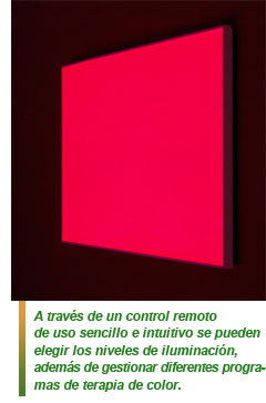 A través de un control remoto de uso sencillo e intuitivo se pueden elegir los niveles de iluminación, además de gestionar diferentes programas de terapia de color. Asimismo, permite la sincronización con las distintas camas de la firma por medio de un sistema simple de conmutación, consiguiendo una inmersión total de la cabina en el color programado.