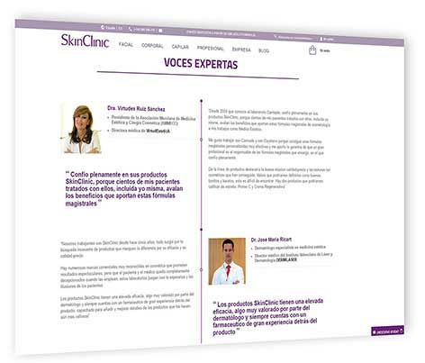 Los últimos lanzamientos, productos clave y promociones destacadas se muestran con un gran slide. Bajo el mismo, se accede directamente a la información sobre el creador y formulador de SkinClinic: Cayetano L. Gutiérrez Solano, así como los puntos de referencia más cercanos en los que se podrá encontrar la marca. A esto se añade una sección especifica con información detallada sobre los activos de sis productos.