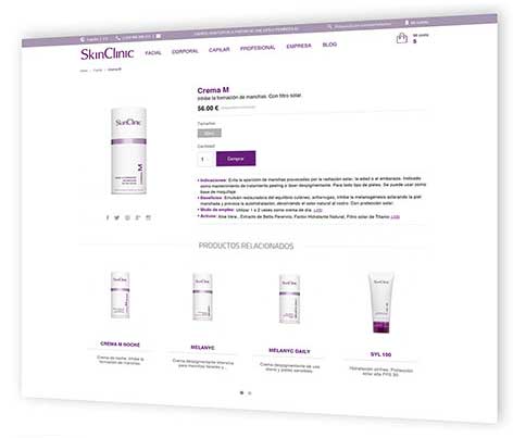 Para facilitar de forma rápida y visual la búsqueda del producto deseado, la amplia gama de productos de SkinClinic se encuentra clasificada con un filtrado de búsqueda, por categoría o necesidad (facial, corporal, capilar). Una vez localizado el producto, se puede obtener más información sobre el mismo y/o añadirlo al carrito de la compra.