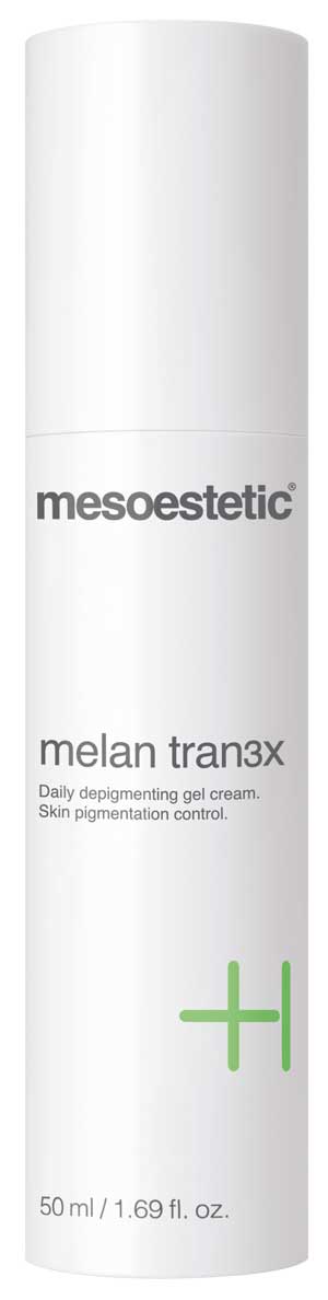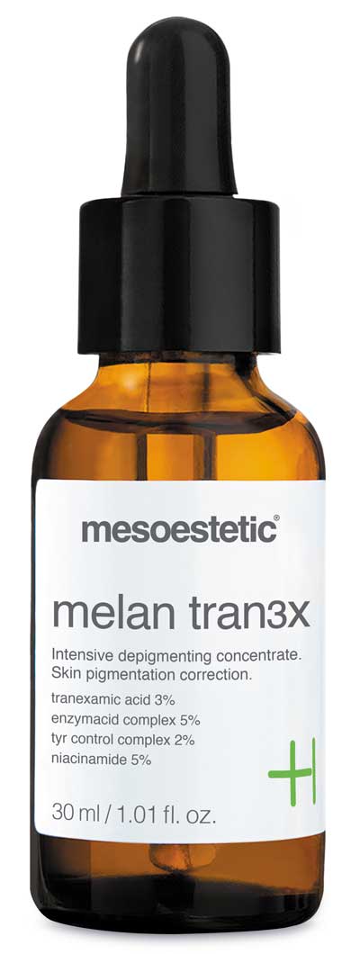 - melan tran3x intensive depigmenting concentrate: serum despigmentante intensivo de textura ultraligera. Actúa sobre las manchas oscuras eliminando la melanina formada y regulando la sobreproducción pigmentaria en origen.