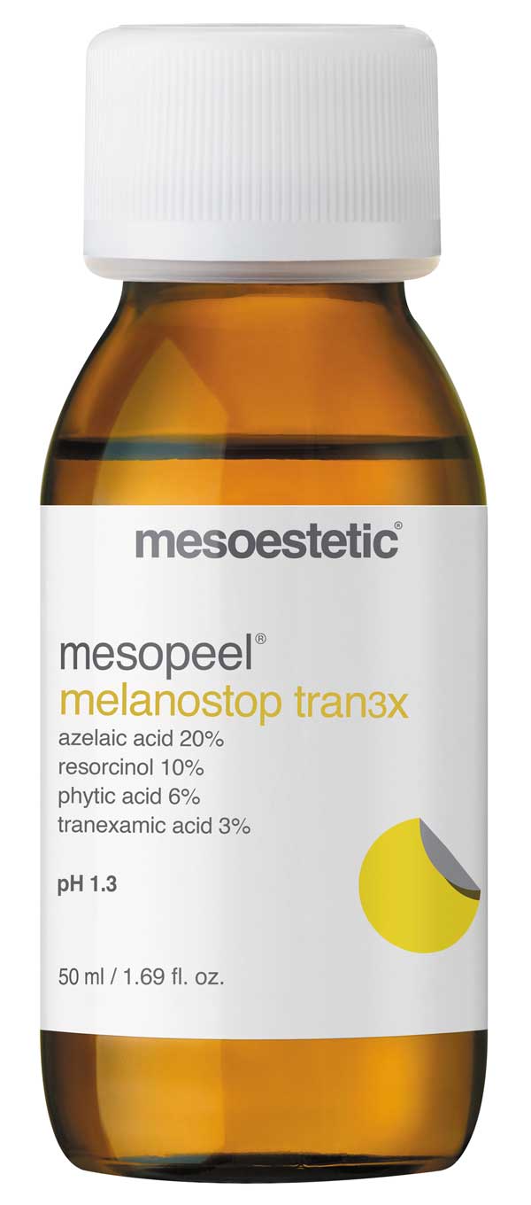 - mesopeel® melanostoptran3x: peeling químico despigmentante cuya fórmula acelera la renovación epidérmica para eliminar la acumulación superficial de melanina. Mejora el tono y la luminosidad.