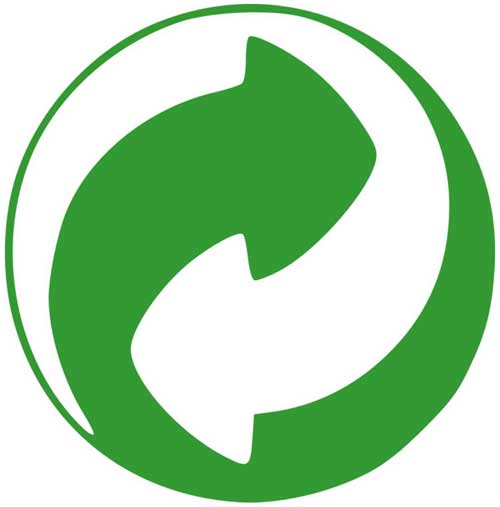 5. Punto verde (Obligatorio). Viene representado con un círculo con dos flechas entrelazadas. Este signo indica que la empresa fabricante ha cumplido la legislación sobre Envases y Residuos de Envases, garantizando que los materiales empleados en su fabricación no dañan al medioambiente. Y que, además, contribuye al reciclado de los materiales, tanto envases como embalajes. Cuando te adhieres a ECOEMBES y pones el símbolo, lo que haces es contribuirá a que se pongan contenedores, se transporte el residuo y luego se recicle.