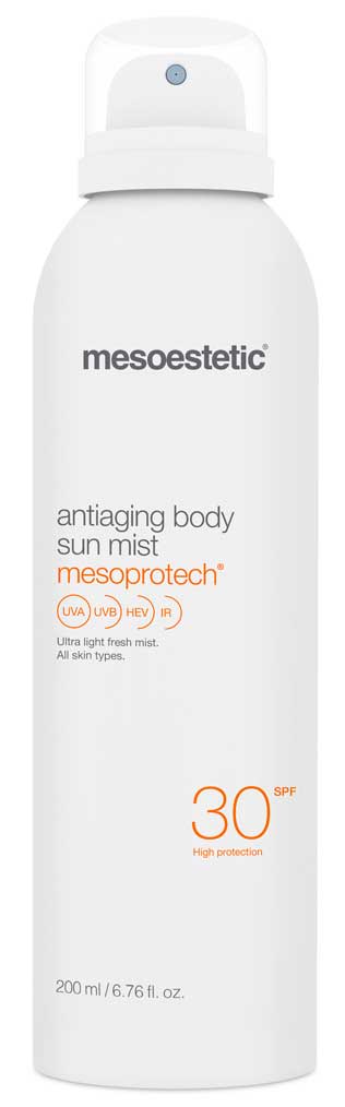 - mesoprotech® antiaging body sun mist SPF30: bruma corporal de alta protección (SPF30), indicada para las personas que practican deporte y/o para personas con un estilo de vida con poco tiempo.