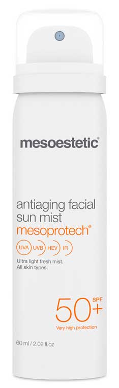 - mesoprotech® antiaging facial sun mist SPF50+: bruma invisible facial de muy alta protección (SPF50+) con textura innovadora, universal y apta para todo tipo de pieles.