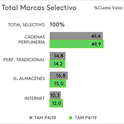 Las fragancias y perfumes son, observando por categorías, las que mantienen estable el segmento selectivo. Sus más de 7 millones de compradores alcanzan ya tres cuartas partes del gasto en productos de belleza selectivos. De todos ellos, además, uno de cada cuatro solo compra este tipo de marcas, mientras el resto de compradores alternan con marcas de otro tipo (mass market, farma, etc.) en el resto de