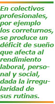 D.E.: Existen diferencias individuales en cuanto a la necesidad de horas de sueño: los llamados cortos dormidores y los dormidores largos. En todo caso, debemos dormir lo justo para poder tener un adecuado funcionamiento diurno. En colectivos profesionales, por ejemplo los correturnos, se produce un déficit de sueño que afecta al rendimiento laboral, personal y social, dada la irregularidad de sus rutinas.