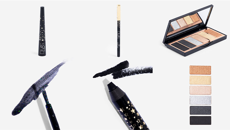 La paleta de DIVA'S te ofrece una gama de tonos golden combinados con tonalidades negras y plata, conseguirás un efecto inigualable si por ejemplo te haces un ahumado y usas estos tonos como base y/o difuminados en el pliegue del párpado. Después, para rematar con un toque de brillo, aplica el Eyeliner negro con glitter. Lookazo total.