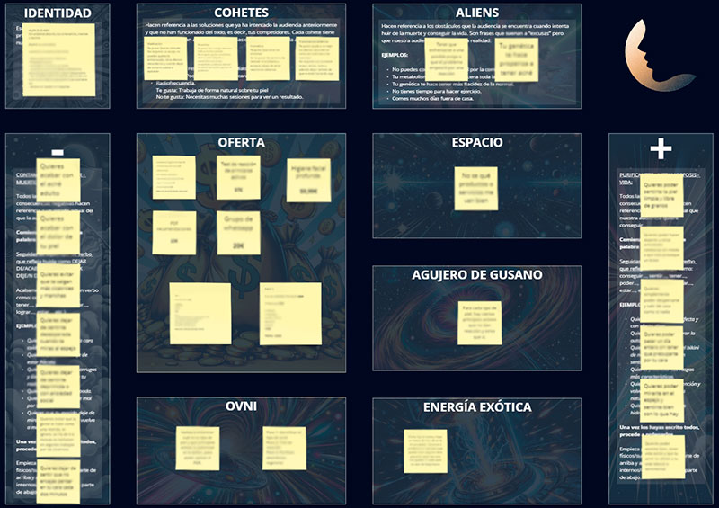 Esta plantilla que podría parecer el mapa del tesoro sacado de una película de ciencia ficción... es en realidad un mapa del tesoro, pero no es ciencia ficción. Es un mapa muy real. Este es el mapa del ADN byBeautyPro. Y contiene toda la información necesaria para conquistar el mercado de la estética. En esos post-it que no puedes leer por confidencialidad, se esconden los deseos más ocultos de tus clientes, los secretos que utiliza tu competencia, y cómo poder desmarcarnos de todo eso con una oferta única y diferencial.