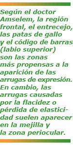 En el caso de las arrugas de expresión, se manifiestan en el tercio superior de la cara. Según el Dr. Amselem, la región frontal, el entrecejo, las patas de gallo y el código de barras (labio superior) son las zonas más propensas a la aparición de las arrugas de expresión. En cambio, las arrugas causadas por la flacidez o pérdida de elasticidad suelen aparecer en la mejilla y la zona periocular.