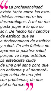 M.P.: La profesionalidad existe tanto entre las esteticistas como entre los dermatólogos. A mi no me gusta jugar a lo que no soy. De hecho hay centros de estética que se autodenominan de estética y salud. En mis folletos no aparece la palabra salud porque yo hago estética. La esteticista cuida de una piel sana para que no enferme y el dermatólogo cuida de una piel con problemas, de una piel enferma. Hay tratamientos que nosotras somos capaces de hacerlos y además de tratarlo a todos los niveles, pero con tiempo, con constancia y con mucha disciplina.