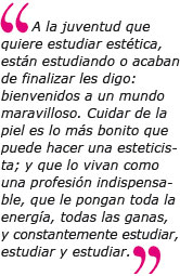 M.P.: Yo tengo la ilusión de que va ir cada vez a mejor; cada vez tenemos mejor aparatología, cada vez tenemos mejor cosmetología, y cada vez tenemos clientas mejor preparadas. La clienta de hoy está informada, sabe lo que quiere y exige profesionales bien formadas. Esto va a hacer que el sector de la estética no pueda dormirse, continuamente hemos de estar estudiando, y la palabra estudiar, con mayúsculas.