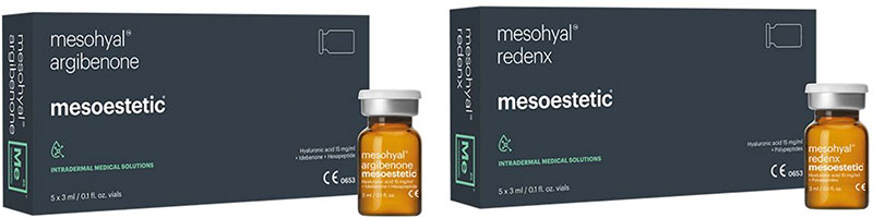 - mesohyal® argibenone: es un tratamiento inyectable antiedad y antioxidante formulado con péptidos que favorece la reducción de líneas de expresión dinámicas y del daño foto-inducido.