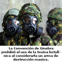 Donde puede haber grave peligro es en el uso de esta toxina como arma de guerra bacteriológica. Desde la segunda guerra mundial, varios países han experimentado con la toxina para crear armas bioquímicas. Por su alta peligrosidad, la Convención de Ginebra la prohibió al considerarla un arma de destrucción masiva. Se le conoce como Agente X o Agente XR y se sospecha que Sadam Hussein llegó a producir toxina botulínica en grandes cantidades para usarla como arma química. Usada para tal fin, produce una parálisis nerviosa que puede provocar la muerte por asfixia o graves lesiones neurológicas por anoxia, al bloquear la función respiratoria.