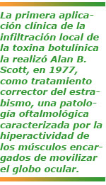 La primera aplicación clínica de la infiltración local de la toxina botulínica la realizó Alan B. Scott, en 1977, como tratamiento corrector del estrabismo, una patología oftalmológica caracterizada por la hiperactividad de los músculos encargados de movilizar el globo ocular. En 1989, la FDA (Food and Drug Administration, USA) aprobó el uso del bótox en tratamientos de estrabismo, blesfarospasmo y espasmos hemifaciales. En el año 2000 se aprobó su uso en el tratamiento de las distonías, y en el 2004 su uso en los tratamientos de hiperhidrosis.