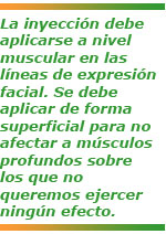 La inyección debe aplicarse a nivel muscular en las líneas de expresión facial. Se debe aplicar de forma superficial para no afectar a músculos profundos sobre los que no queremos ejercer ningún efecto.