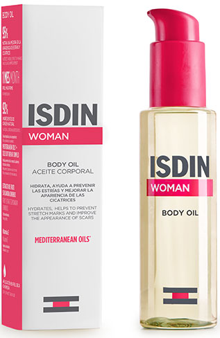Isdin Woman Body Oil es un aceite corporal multibeneficio con un 92% de ingredientes de origen natural que previene y reduce la aparición de estrías, mejora el aspecto de las cicatrices y potencia la firmeza de la piel