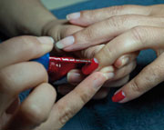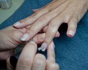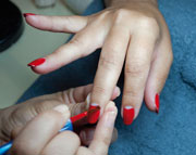En Mi calle de Nueva York, después de realizar una manicura normal y realizar la fase de hidratado, con aceites a base de acido hialurónico, rosa mosqueta o caviar en las manos, se pasa a la fase de maquillaje en media luna.