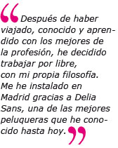 F.V.: Después de haber viajado, conocido y aprendido con los mejores de la profesión, he decidido trabajar por libre, con mi propia filosofía. Me he instalado en Madrid gracias a Delia Sans, una de las mejores peluqueras que he conocido hasta hoy. Delia me ha cedido un espacio de estética en su Instituto de Belleza del barrio de Salamanca.