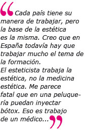 F.V.: Cada país tiene su manera de trabajar, pero la base de la estética es la misma. Creo que en España todavía hay que trabajar mucho el tema de la formación. El esteticista trabaja la estética, no la medicina estética. Me parece fatal que en una peluquería puedan inyectar bótox. Eso es trabajo de un médico. Nosotros, como esteticistas, podemos colaborar con un médico. En España no hay diálogo entre el sector de estética y el médico, lo que es una pena, porque juntos podemos hacer un excelente trabajo.