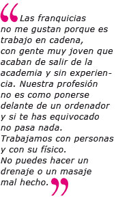 M.V.: Las franquicias no me gustan porque es trabajo en cadena, con gente muy joven que acaban de salir de la academia y sin experiencia. Nuestra profesión no es como ponerse delante de un ordenador y si te has equivocado no pasa nada. Trabajamos con personas y con su físico. No puedes hacer un drenaje o un masaje mal hecho.