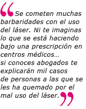 M.V.: Muchas, como puede ser en el uso del láser. Ni te imaginas lo que se está haciendo bajo una prescripción en centros médicos… si conoces abogados te explicarán mil casos de personas a las que se les ha quemado por el mal uso del láser.