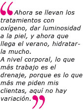 M.V.: Ahora se llevan los tratamientos con oxígeno, dar luminosidad a la piel, y ahora que llega el verano, hidratarla mucho. A nivel corporal, lo que más trabajo es el drenaje, porque es lo que más me piden mis clientas, aquí no hay variación.