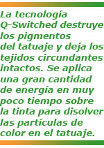 Durante el proceso de tatuado, el pigmento del tatuaje (tinta) es llevado a la piel y depositado dentro de la capa dermis indefinidamente. La tecnología Q-Switched destruye los pigmentos del tatuaje y deja los tejidos circundantes intactos. Se aplica una gran cantidad de energía en muy poco tiempo sobre la tinta para disolver las partículas de color en el tatuaje. El cuerpo elimina las pequeñas partículas de tinta restantes vía sistema linfático en los siguientes 2 o 3 meses, por lo que, tras la sesión, la recomendación principal es ingerir mucha agua.El número de sesiones necesarias para la eliminación total del tatuaje, que se espacian cada 3 meses, depende no sólo del tamaño sino también de la profundidad a la que se encuentra la tinta en la dermis.