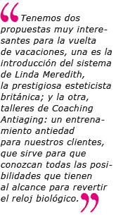 M.G.: Tenemos dos propuestas muy interesantes para la vuelta de vacaciones, una es la introducción del sistema de Linda Meredith, la prestigiosa esteticista británica; y la otra, talleres de Coaching Antiaging: un entrenamiento antiedad para nuestros clientes, que sirve para que conozcan todas las posibilidades que tienen al alcance para revertir el reloj biológico. Este concepto antiaging añadirá mucho valor a los tratamientos, porque es un tratamiento global. El fin es que todos nuestros clientes sean ageless.