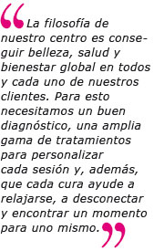M.G.: Conseguir belleza, salud y bienestar global en todos y cada uno de nuestros clientes. Para esto necesitamos un buen diagnóstico, una amplia gama de tratamientos para personalizar cada sesión y, además, que cada cura ayude a relajarse, a desconectar y encontrar un momento para uno mismo. Unimos técnicas orientales con lo último en tecnología para un buen resultado. Y todo ello sin olvidar la sensibilidad, comprensión y cordialidad con cada persona.