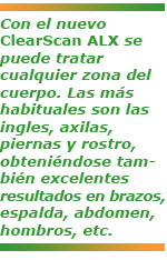 Se puede tratar cualquier zona del cuerpo. Las más habituales son las ingles, axilas, piernas y rostro, obteniéndose también excelentes resultados en brazos, espalda, abdomen, hombros, etc. Además, el ClearScan ALX penetra incluso en los folículos cerrados consiguiendo eliminar los pelos enquistados de una forma segura y eficaz.¿Cuántas sesiones son necesarias?