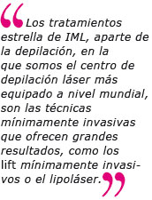 G.P-S.: Más que un tratamiento estrella, tenemos más bien una constelación de tratamientos altamente depurados que tienen un alto grado de demanda por parte de nuestros pacientes. Los tratamientos estrella de IML, aparte de la depilación, en la que somos el centro de depilación láser más equipado a nivel mundial, son las técnicas mínimamente invasivas que ofrecen grandes resultados, como los lift mínimamente invasivos o el lipoláser: en cada unidad de IML contamos con una técnica puntera como Acné Repair, Striae Repair o Skin Revital para dermatología y facial o la Terapia Fotodinámica de Varices y el Super Vein Removal para eliminar telangiectasias.