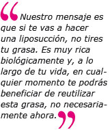 H.S.: Nuestro mensaje es que si te vas a hacer una liposucción, no tires tu grasa. Es muy rica biológicamente y, a lo largo de tu vida, en cualquier momento te podrás beneficiar de reutilizar esta grasa, no necesariamente ahora.