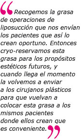 H.S.: Recogemos la grasa de operaciones de liposucción que nos envían los pacientes que así lo crean oportuno. Entonces cryo-reservamos esta grasa para los propósitos estéticos futuros, y cuando llega el momento la volvemos a enviar a los cirujanos plásticos para que vuelvan a colocar esta grasa a los mismos pacientes donde ellos crean que es conveniente, por ejemplo en un aumento de mamas, en un aumento de glúteos o en un aumento de volumen facial. Es decir, reutilizan la grasa que han sacado de una liposucción para propósitos de belleza en el mismo paciente.
