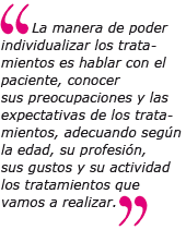 M.J.B.: La manera de poder individualizar los tratamientos es hablar con el paciente, conocer sus preocupaciones y las expectativas de los tratamientos, adecuando según la edad, su profesión, sus gustos y su actividad los tratamientos que vamos a realizar.