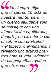 M.J.B.: Yo siempre digo que el cuerpo 10 está en nuestra mente, pero un cuerpo saludable solo se consigue con una alimentación equilibrada, deporte, no excederse con el sol, ni con el alcohol y el tabaco, o eliminarlos, y teniendo una actitud positiva ante la vida. Además de las pequeñas ayudas que ofrecemos.