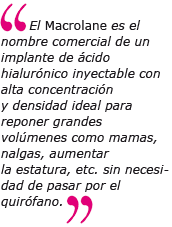 M.J.B.: El Macrolane es el nombre comercial de un implante de ácido hialurónico inyectable con alta concentración y densidad, ideal para reponer grandes volúmenes como mamas, nalgas, aumentar la estatura, etc. sin necesidad de pasar por el quirófano.