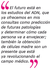 M.J.B.: Los estudios del ADN, que ya ofrecemos en mis consultas como predicción de futuras patologías y determinar cómo cada persona va a envejecer; también la obtención de células madre son un presente que está ya revolucionando el campo médico.